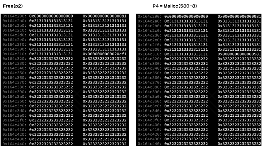 p2부분을 free하여 freed chunk로 만들어주고, 정확히 기존 크기(header 크기제외하고.. 어차피 알아서 +8 해줌)만큼 malloc을 하게되면, 같은위치에 chunk를 할당하게 되고 p3부분까지 덮을 수 있게 된다.