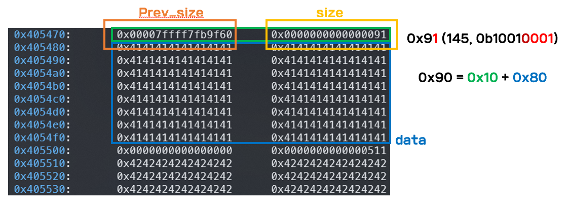 - prev_size : 이전 청크의 크기로 크기가 128bit 이상인 chunk가 free될 때, 다음 청크 prev_size가 세팅