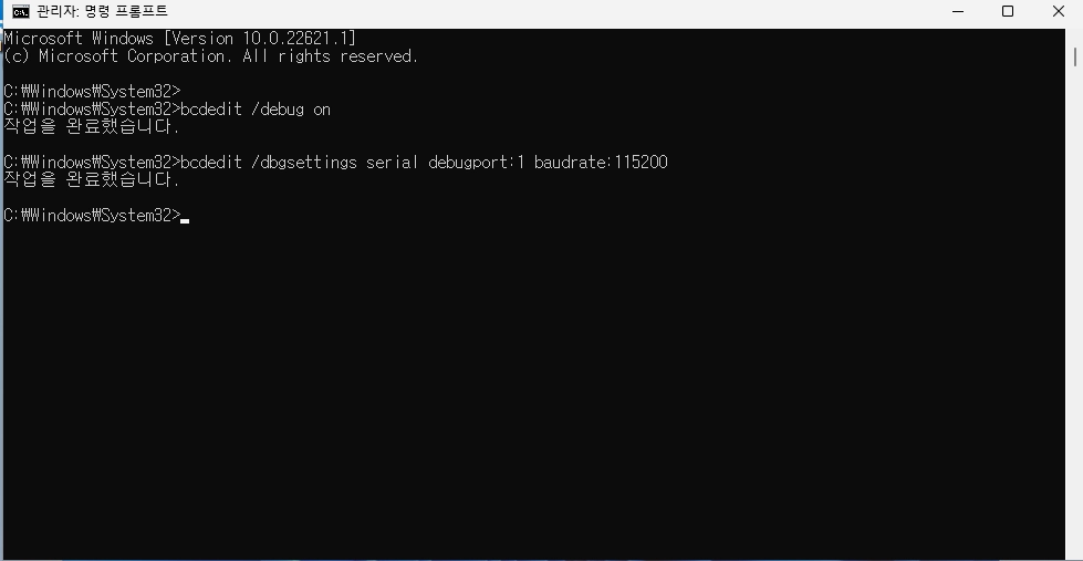 baud rate는 일반적으로 115200을 사용한다. Microsoft 문서도 직렬 디버깅 시 이 구성을 안내한다.