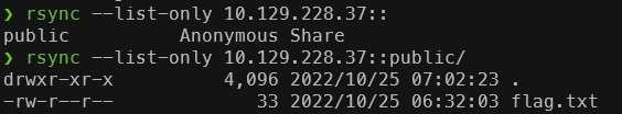 rsync 10.129.228.37::public/flag.txt . 로 파일을 다운 받아 확인하면 해결.